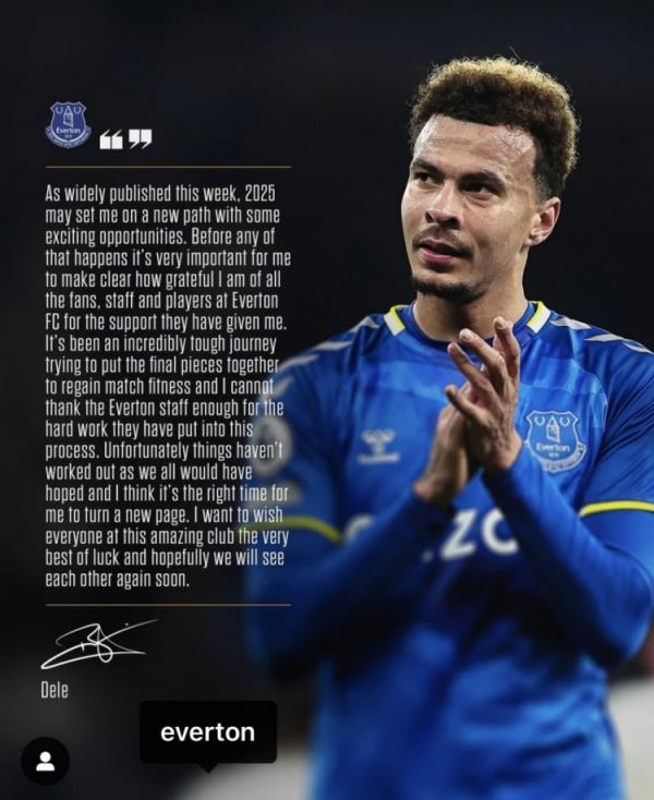 阿里寫(xiě)道:“正如本周大家廣泛談?wù)摰哪菢樱?025年我可能會(huì)走上一條新的道路,因?yàn)橛幸恍┝钊烁械脚d奮的的機(jī)會(huì)。在這一切發(fā)生之前,我必須要先明確的表達(dá)一下我對(duì)于所有球迷的感激之情,以及埃弗頓所有工作人員以及球員對(duì)我的支持。